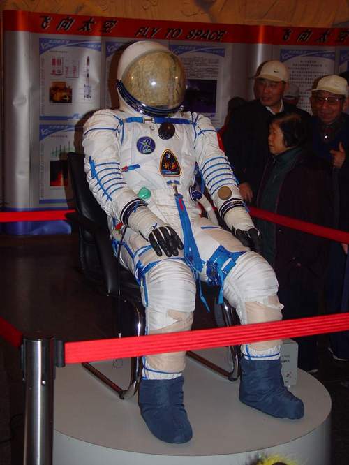 二層大廳內,在大禹、秦皇、漢武、張衡、曹雪芹等歷代中華精英的浮雕環顧下,《飛向太空》( fly to space )用翔實的數據、通俗的文字、生動的圖畫介紹人類飛天的艱苦卓絕的歷程。一套完整的航天服,如真人一般坐在一張椅子上,似曾相識,又神秘無比,幾乎吸引了每一位參觀者。幾臺經過調整的平常的磅秤,把地球人在月球、金星……上的重量約出來,明白地告訴你,引得一向沉穩的張一萍、許荷香激動不已,奔走相告。
