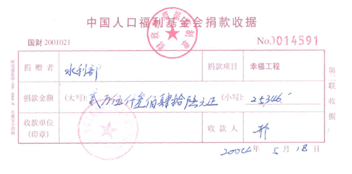 此次捐款總額為25346元,上交幸福工程組織工作委員會25346元(附憑證)。另外,幸福工程組織委會辦公室主任此次在中央國家機關計劃生育辦公室的募捐現場,親自為捐款單位頒發捐贈證書,以示感謝。