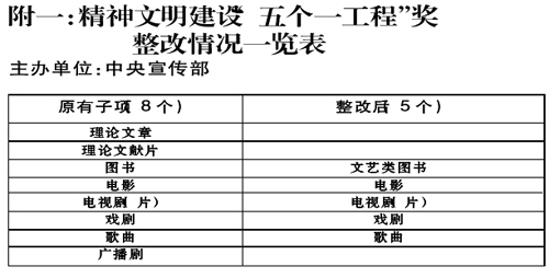 由中央宣傳部主辦的精神文明建設“五個一工程”獎,所設子項由原來8個減少為電影、電視劇(片)、戲劇、歌曲、文藝類圖書5個。評選工作三年一次。