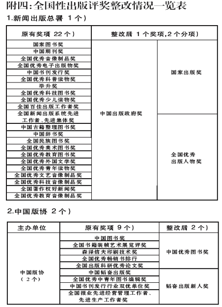 新聞出版總署現有全國性評獎22個。整改后,設立“中國出版政府獎”,由原來的22個減至1個。評選工作兩年一次。“中國出版政府獎”下設“國家出版獎”和“全國優秀出版人物獎”2個子項。