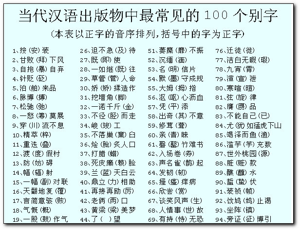 據(jù)透露,表中所列100個別字,都是高頻別字,在當代出版物中長期出現(xiàn)、廣泛出現(xiàn)、反復出現(xiàn),其差錯率甚至占到某些出版物別字量的50%以上,具有極大的易混性和頑固性。其中差錯率最高的十個字是(括號中是正字):松馳(弛)、穿(川)流不息、渡(度)假村、一幅(副)對聯(lián)、既(即)使、挖墻角(腳)、再接再勵(厲)、談笑風聲(生)、渲(宣)泄、九洲(州)。