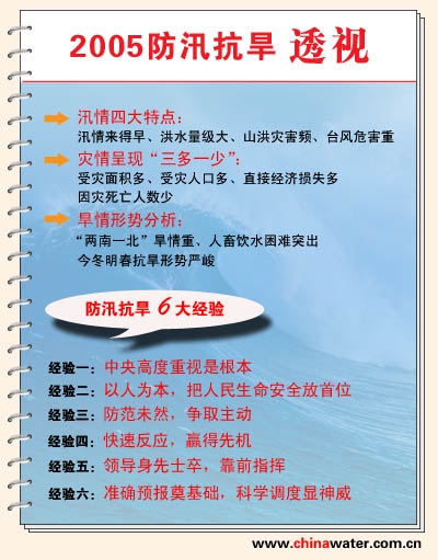 2005年的汛情有其特點,防汛抗洪工作則可稱可道、可圈可點。我國珠江流域、福建閩江、淮河干流、遼河流域的渾河、太子河等江河發生了較大洪水和大洪水,其中珠江流域西江中下游發生了超過百年一遇的特大洪水。長江支流漢江、黃河支流渭河發生了較為嚴重的秋汛。湖南、黑龍江等省發生了嚴重的山洪、泥石流、滑坡災害。與此同時,海南、云南、廣西等地發生了較為嚴重的春旱,內蒙、寧夏、湖南等地發生了嚴重夏伏旱。到目前為止,今年有8個臺風或熱帶風暴在我國東南、華南沿海登陸,給福建、浙江、海南、安徽等省造成嚴重損失。在黨中央、國務院的正確領導下,國家防總精心組織、科學調度,國務院有關部委和地方各級黨委政府緊急動員、密切配合,廣大軍民團結奮戰、頑強拼搏,奪取了今年防汛抗旱工作的全面勝利。