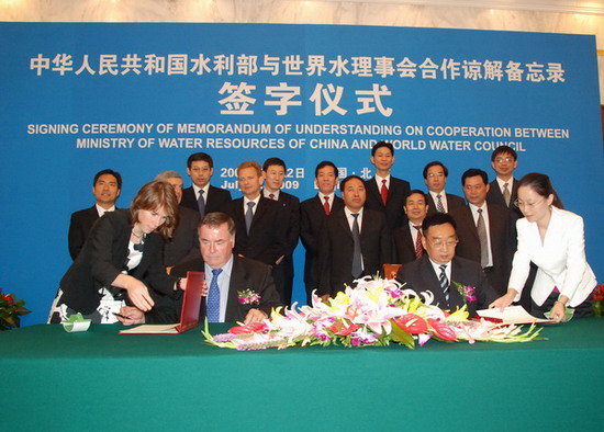 2009年7月22日晚,水利部陳雷部長與世界水理事會福勛主席在釣魚臺國賓館正式簽署經國務院批準的《中華人民共和國水利部與世界水理事會合作諒解備忘錄》,中國成為世界水理事會成員國。水利部副部長胡四一,水利部黨組成員、辦公廳主任陳小江,我社湯鑫華社長及相關司局單位負責人參加了簽字儀式。