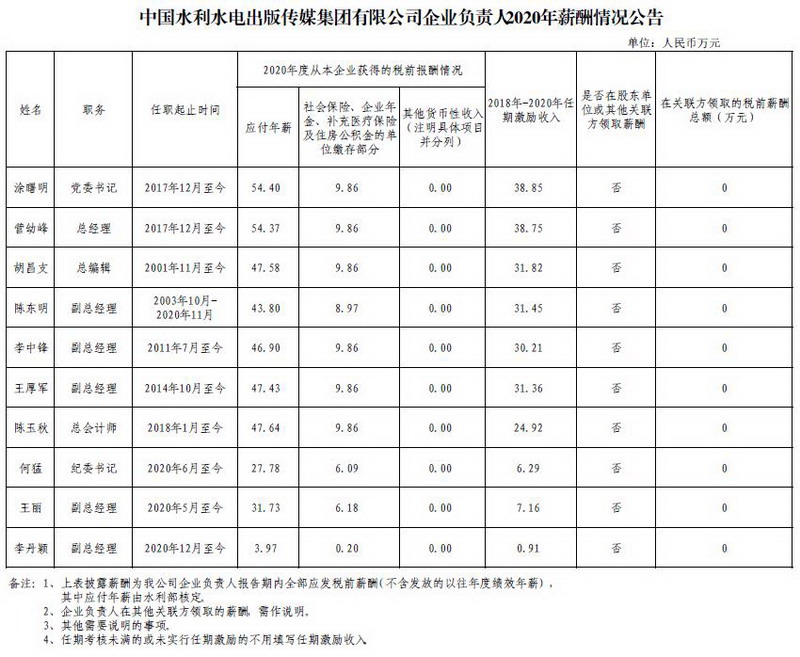 水電知識網»資訊»出版傳媒資訊»中國水利水電出版傳媒集團有限公司企業負責人2020年薪酬情況公告