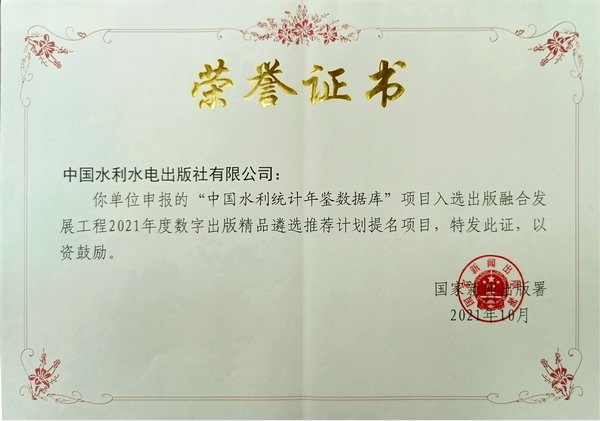 10月21日,中宣部國(guó)家新聞出版署公布了出版融合發(fā)展工程2021年度入選項(xiàng)目。由水利部選送、中國(guó)水利水電出版社有限公司建設(shè)運(yùn)營(yíng)的“中國(guó)水利統(tǒng)計(jì)年鑒數(shù)據(jù)庫(kù)”成功入選數(shù)字出版精品遴選推薦計(jì)劃提名項(xiàng)目。