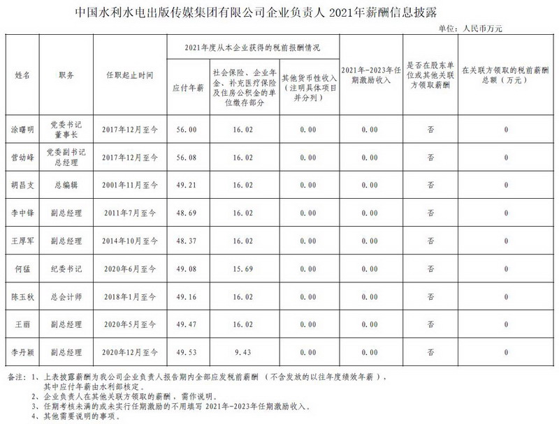 水電知識網»資訊»出版傳媒資訊»中國水利水電出版傳媒集團有限公司企業負責人2021年薪酬信息披露