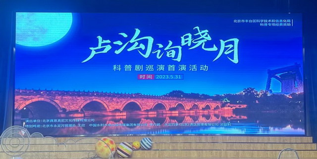 2023年5月31日,在“六一”兒童節即將到來之際,由北京市豐臺區科學技術和信息化局科普專項經費資助,北京賽恩奧尼文化傳媒有限公司承辦,中國水利水電出版傳媒集團、北京市永定河管理處、永定四季(北京)酒店管理有限公司等單位提供支持的水利科普劇《盧溝詢曉月》首演活動在北京小學豐臺萬年花城分校舉辦,集團黨委委員、副總經理李丹穎出席。