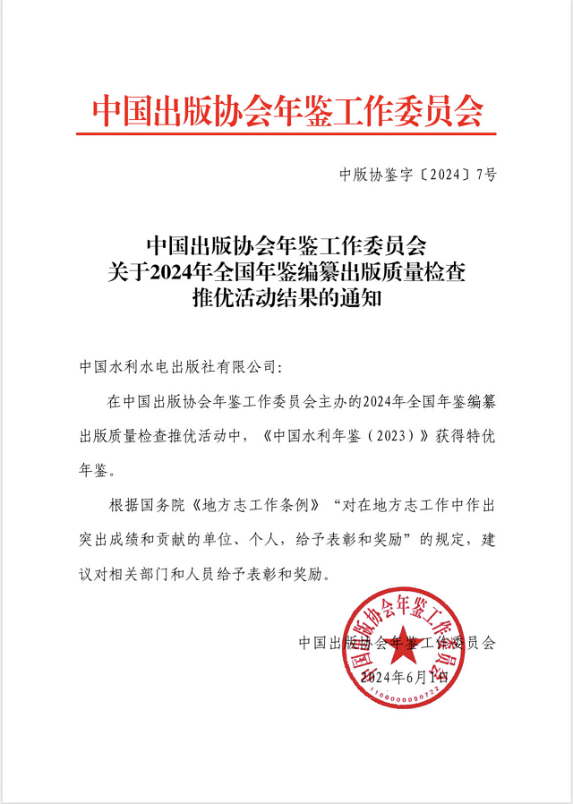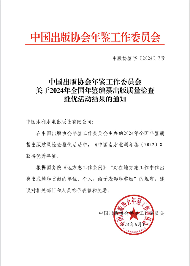 近日, 中國(guó)出版協(xié)會(huì)年鑒工作委員會(huì)發(fā)布了《2024 年全國(guó)年鑒編纂出版質(zhì)量檢查推優(yōu)活動(dòng)結(jié)果公布的通知》(中版協(xié)鑒字〔2024〕7號(hào)文)。由我社編輯出版的《中國(guó)水利年鑒2023》被評(píng)為“特優(yōu)年鑒”,《中國(guó)南水北調(diào)年鑒2022》《中國(guó)河湖年鑒2022》獲評(píng)“優(yōu)秀年鑒”。