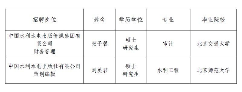根據水利部公開招聘工作有關規定及我集團2025年度公開招聘工作方案,現將擬聘用工作人員予以公示。公示期間如有問題,請向我集團反映。