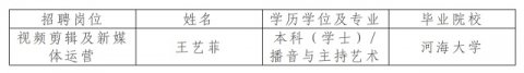 北京中水傳媒文化有限公司根據(jù)中國水利水電出版?zhèn)髅郊瘓F招聘管理辦法和公司招聘實施方案,確定王藝菲為擬聘用人選,現(xiàn)予以公示。公示期間,如有問題,請向我司反映。
